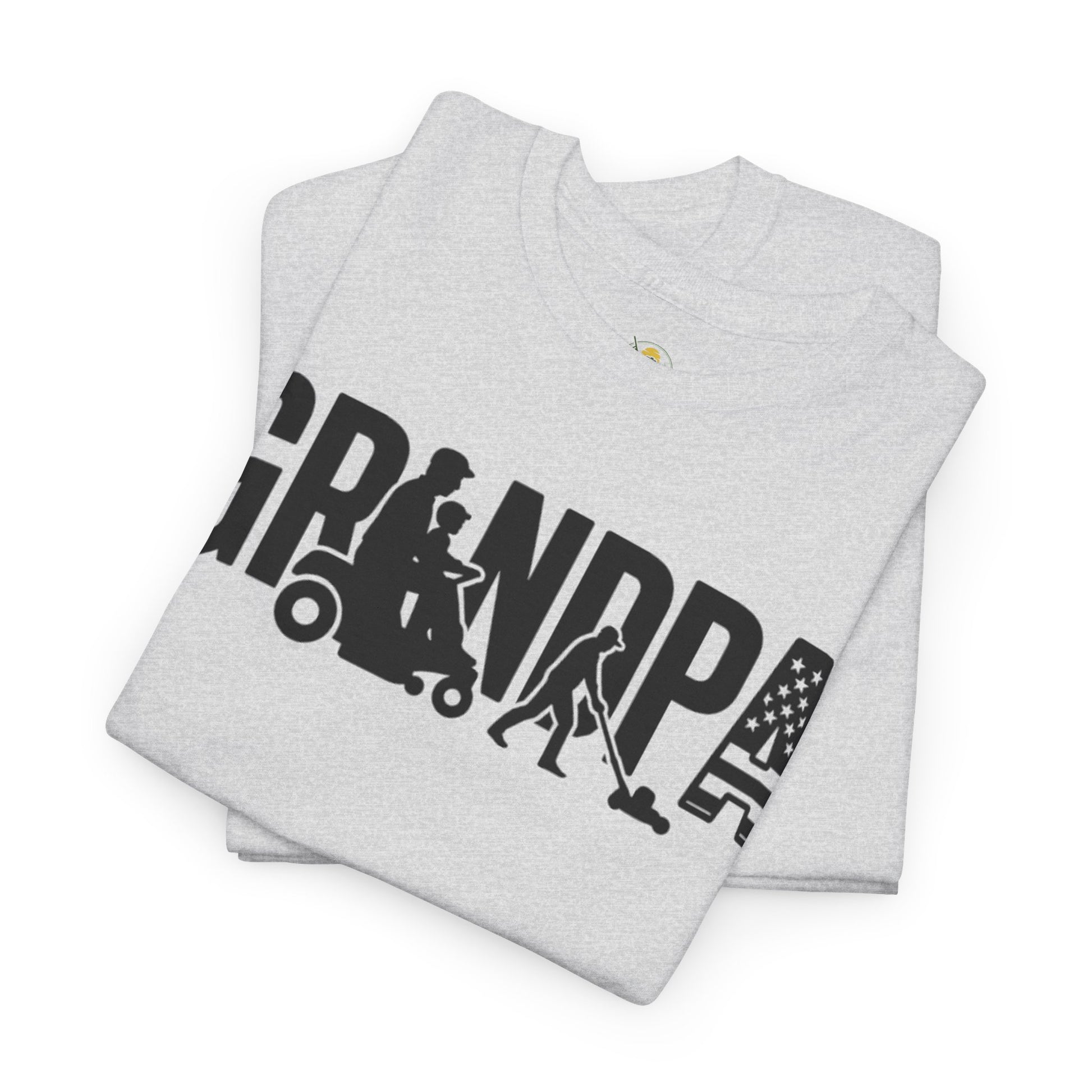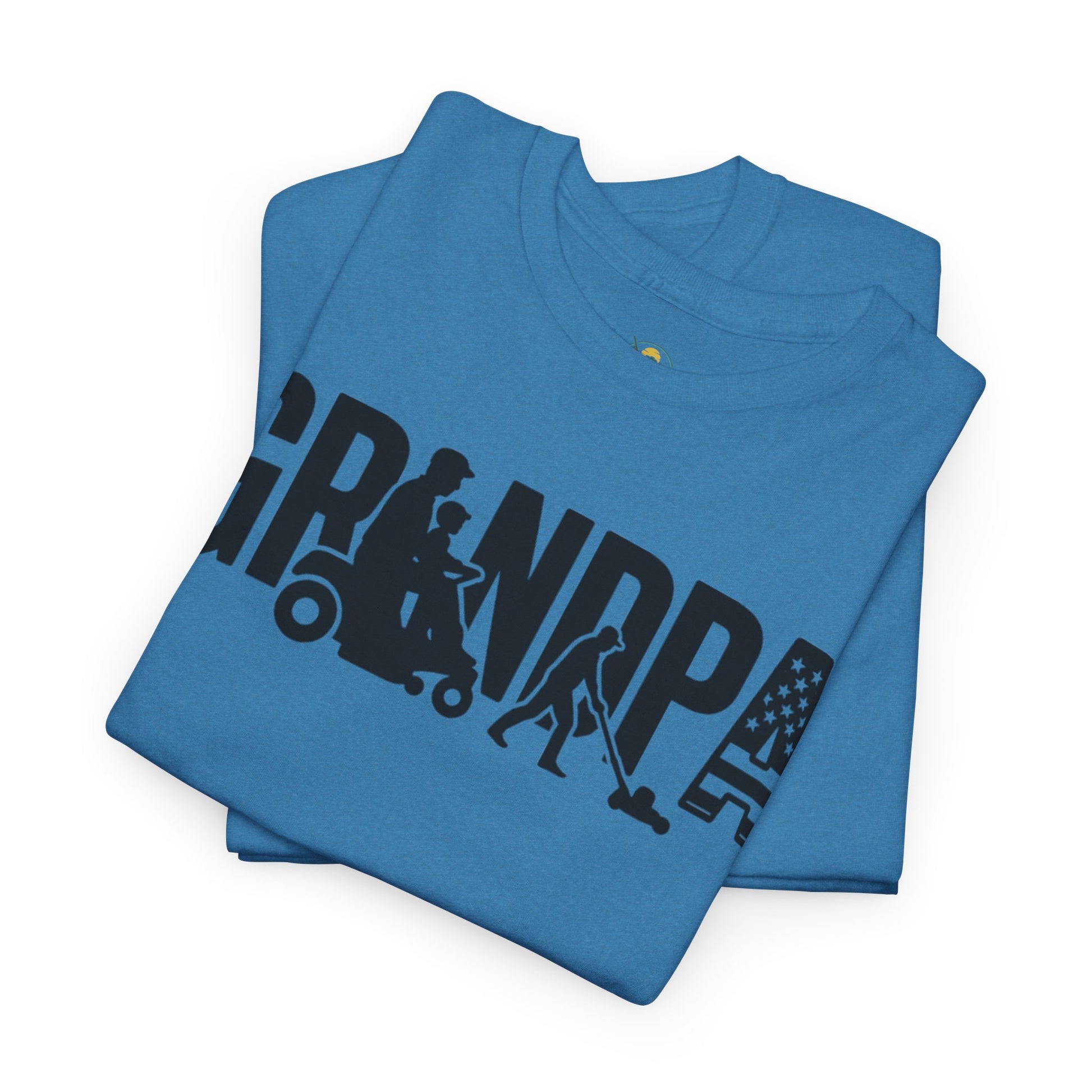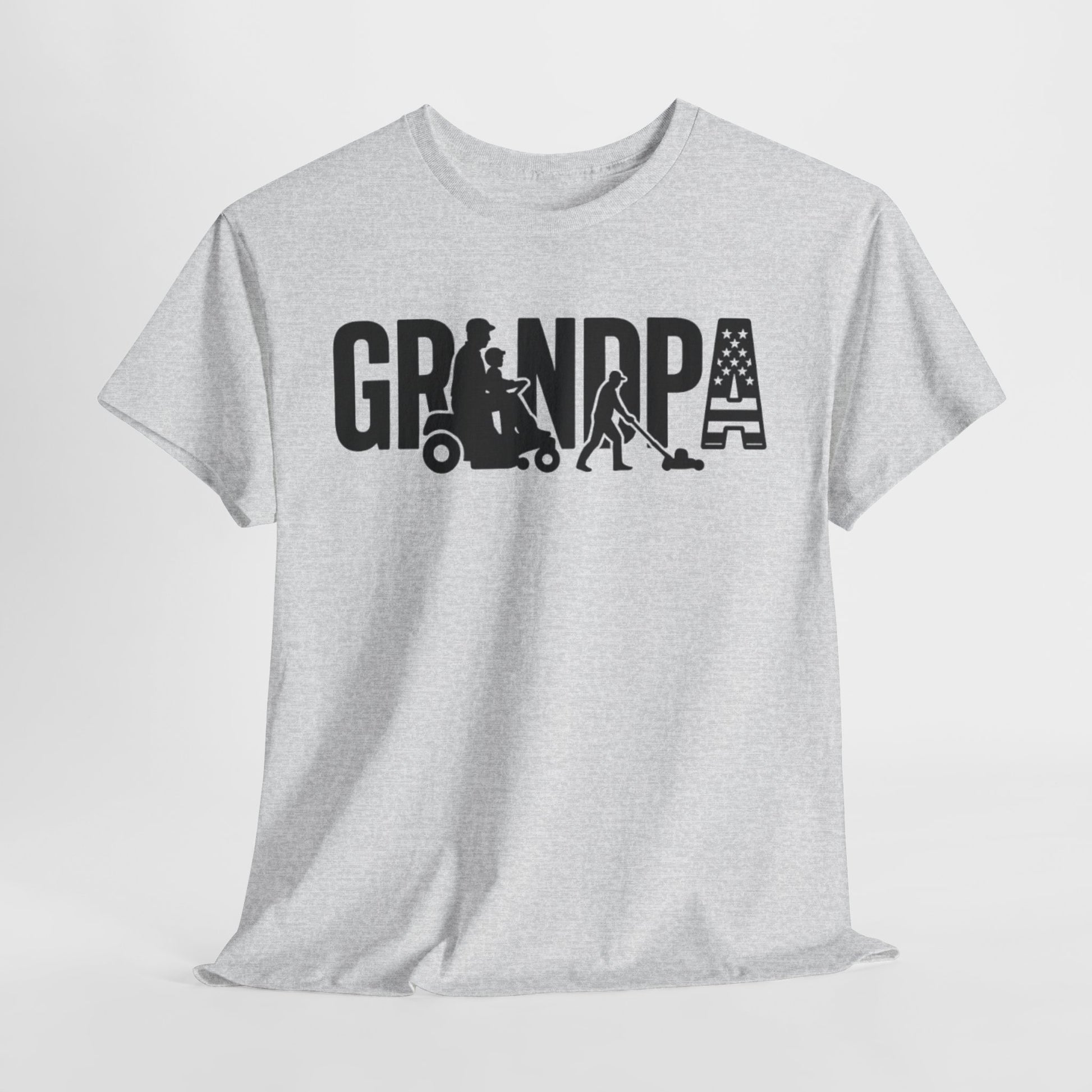 This bold GRANDPA shirt features crisp black silhouettes: Grandpa riding a mower with a child, pushing a mower, and proudly displaying an American flag. The clean block-letter design makes it perfect for family barbecues, Father’s Day, 4th of July or showing off that proud yard-dad spirit.